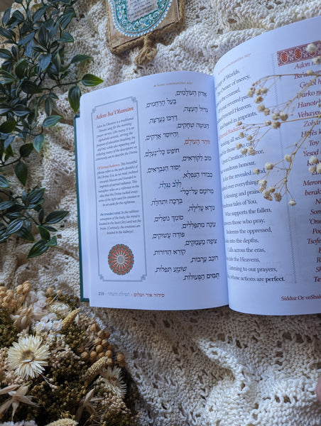 Siddur Or veShalom is for Shabbat and festivals, containing the liturgy for weekly Shabbat services, and all additions needed on Yom Tov, as well as Rosh Hodesh, Shabbat Hol haMo’ed and Hanukkah. This siddur also includes beautiful art pieces by a range of community contributors, various additions to the Torah service to mark life cycle events, and a large back section of home ceremonies with pizmonim (songs) for the table.